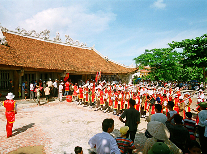 Tiếng chiêng trống, tiếng hô vang, cờ bay phần phật đầy khí thế. Mỗi khi hai bên giáp nhau ở sân đình, quân lính cùng dân chúng hét lớn vang dậy cả một vùng. Hai tướng múa những đường đao đẹp mắt, hai đoàn quân gặp nhau ba lần, tượng trưng cho ba lần đánh thắng quân Nguyên thời Trần.