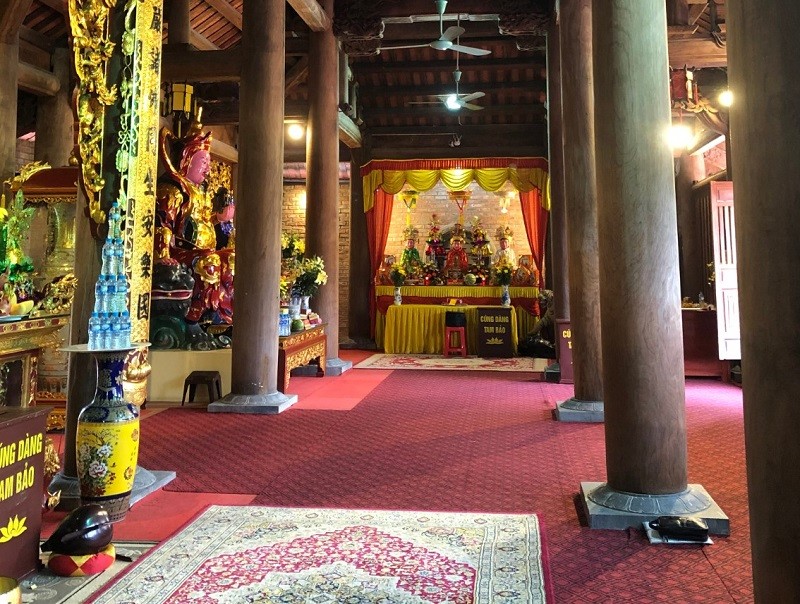 Mái đền được xây dựng có 2 tầng 8 mái. Những họa tiết hoa văn chạm trổ tại đây đều tinh xảo với mái lợp ngói mũi hài. Hiện nay ngôi đền này vẫn lưu giữ ba tấm bia cổ có niên đại từ những năm 1879, trên bia cổ có những thông tin về những người đã góp công và góp của để trùng tu và xây dựng lại đền.